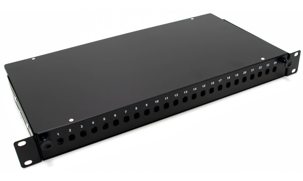19" optický rozvaděč, pro 24 adaptérů ST, barva černá, kovová skříň, kazeta na 24 svarů. Vana výsuvná.