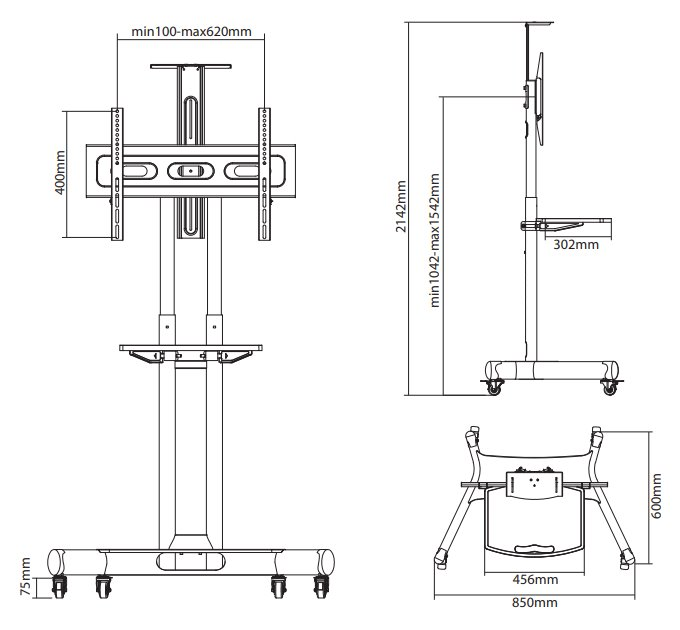 Mobilní podlahový stojan pro ploché obrazovky s úhlopříčkou od 32" do 75" a hmotností až 50 kg. Držák je manuálně výškově nastavitelný v rozmezí 104,2 až 154,2 cm. Navíc disponuje 2 policemi pro příslušenství a kameru.