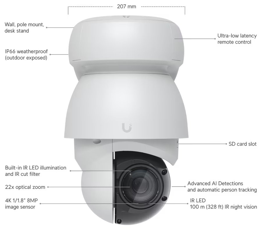 Průmyslová PTZ kamera s rozlišením 4K 3840 × 2160 px a PoE++ napájením. Nabízí vylepšené AI funkce, 22násobný optický zoom a noční IR přísvit s dosahem až 100 m.
