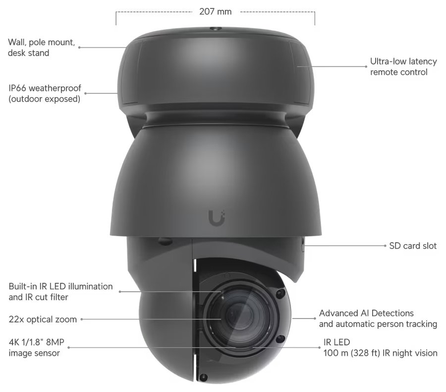 Průmyslová PTZ kamera s rozlišením 4K 3840 × 2160 px a PoE++ napájením. Nabízí vylepšené AI funkce, 22násobný optický zoom a noční IR přísvit s dosahem až 100 m.