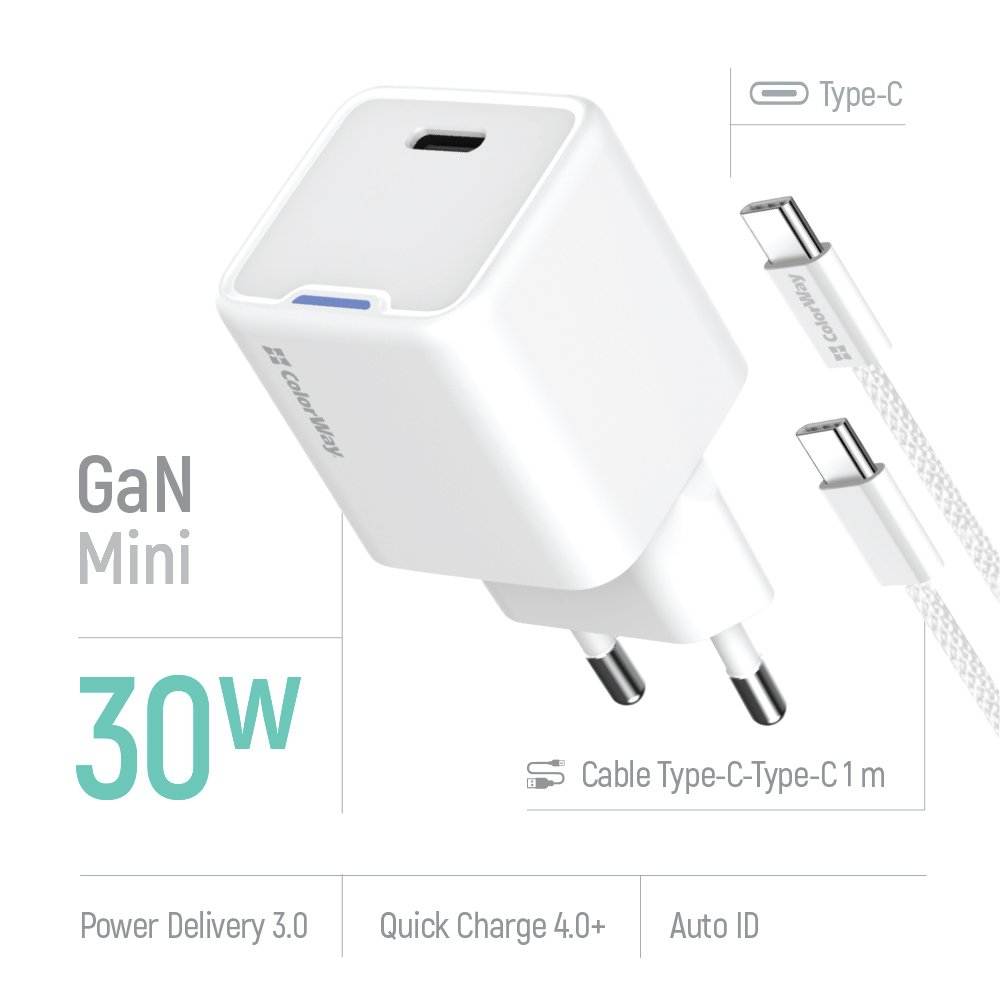 ColorWay GaN Mini je moderní, kompaktní a výkonná USB-C nabíječka využívající pokročilou technologii nitridu galia (GaN), která zajišťuje menší rozměry, nižší hmotnost a vyšší účinnost ve srovnání s tradičními adaptéry. S maximálním výkonem 30 W podporuje všechny hlavní rychlonabíjecí protokoly včetně PD 3.0 s PPS, Quick Charge 4.0+ a dalších standardů předních výrobců.