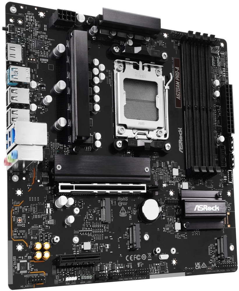Základní deska disponuje 6+2+1fázovým napájením s Dr.MOS pro spolehlivý přísun energie do procesoru a následný stabilní chod i velmi náročných aplikací. Přítomny jsou také volné sloty pro operační paměť typu DDR5, které pojmou až 256 GB. Model ASRock A620AM Pro-A si poradí také s instalací moderních grafických karet, nebo ultra rychlými SSD jednotkami, které napěchujete do M.2 slotů.