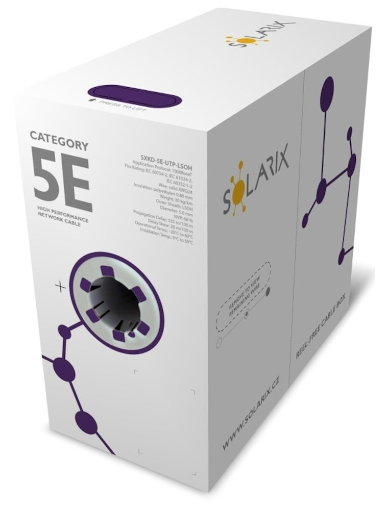 Kvalitní nestíněný instalační kabel kategorie 5E s požární klasifikací Dca-s1,d2,a1 testovaný až do 350 MHz.