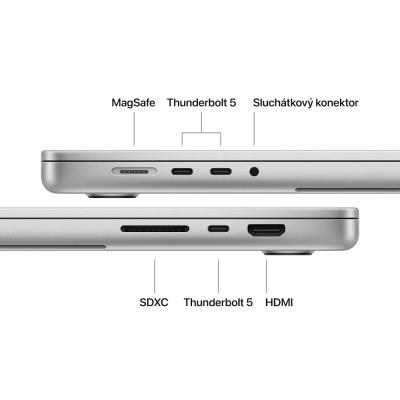 Konektivita: 3× Thunderbolt 5 (až 120 Gb/s), HDMI (až 8K), slot SDXC, MagSafe 3, 3,5mm jack, Wi-Fi 7, Bluetooth 6